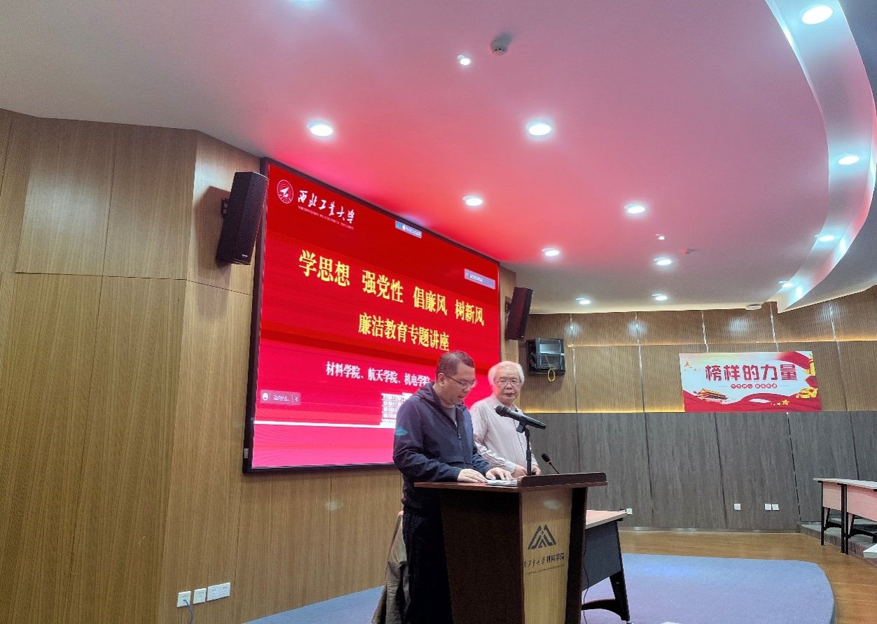 党委联合材料学院、机电学院及计算机学院党委在研究生东馆开展“学思想 强党性 倡廉风 树新风”廉洁教育专题讲座,邀请到中共陕西省委党校卢飞鹰教授作《中国传统防腐惩贪制度建设与现代启示》主题报告。报告会分线下主会场和线上视频分会场,由材料学院党委副书记蔡利剑主持。