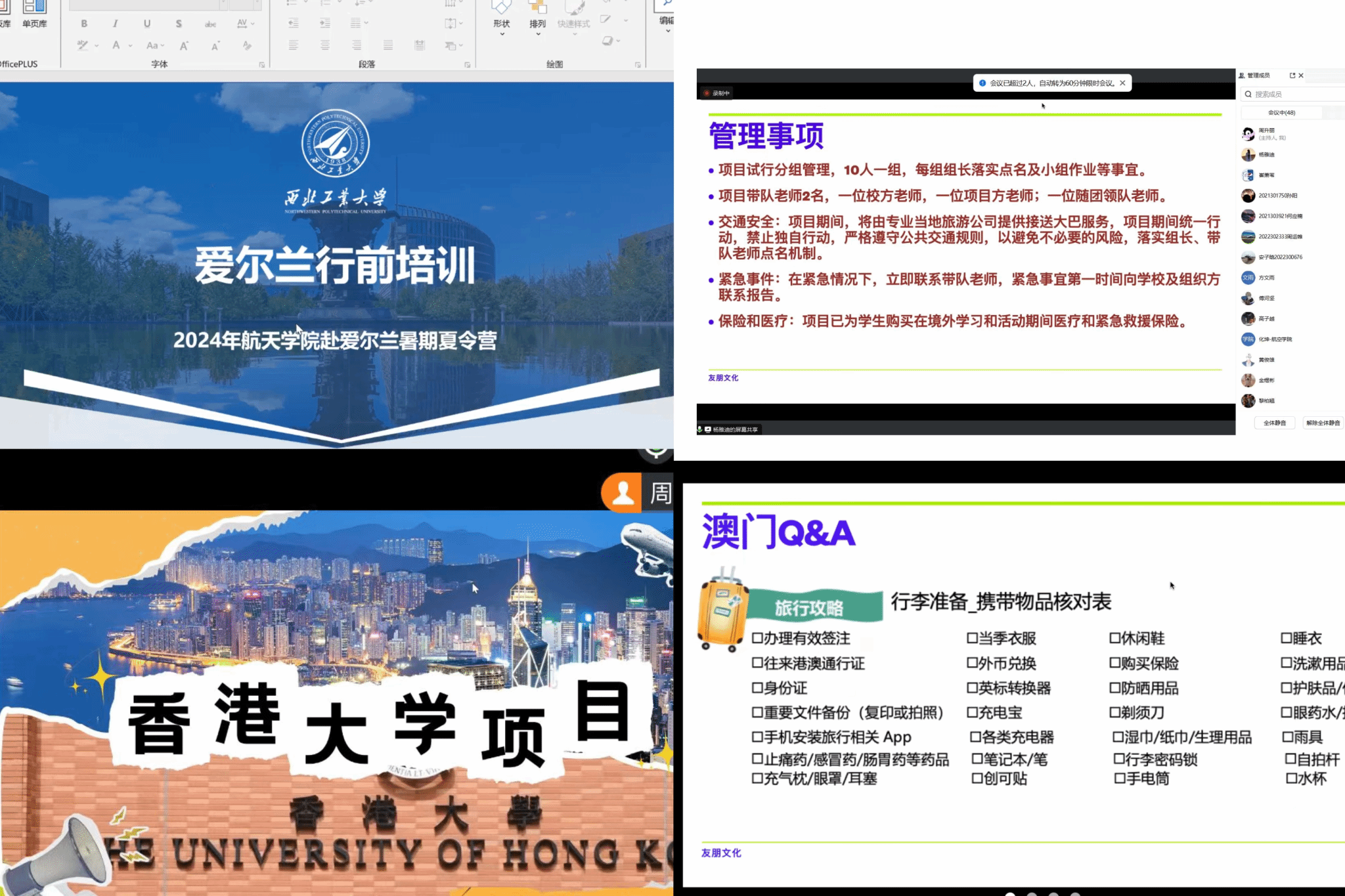 英国剑桥大学-莱斯特大学暑期项目、爱尔兰高威大学暑期项目、香港大学暑期项目、香港理工大学暑期项目、澳门科技大学-澳门大学暑期项目。为进一步强化学生涉外礼仪及安全防范意识,更好适应境外短期学习、生活,在学校国际合作处“平安留学”行前培训基础上,免费直播