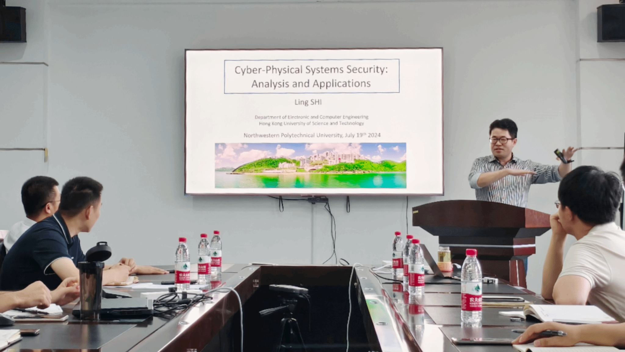 首先,施老师以香港科技大学的一张图片开端,与大家聊起了他在港科大学习、任教的故事,屋外虽是连绵阴雨天,会议室气氛却十分活跃。讲座开始,施老师结合时事案例介绍了信息物理系统的相关背景,讲述了其特点及分类,说明了研究必要性与港科大团队取得的成果。