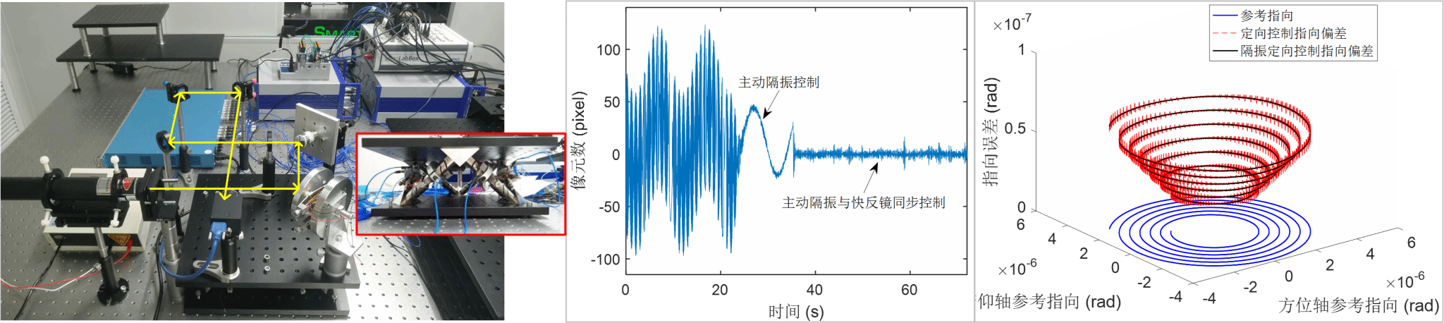 3. 提出了一种宽频带微振动抑制与高精度跟瞄一体化控制方法,通过隔振定向控制及自适应控制设计,在保证超静力学环境的同时提高了系统的跟瞄精度。