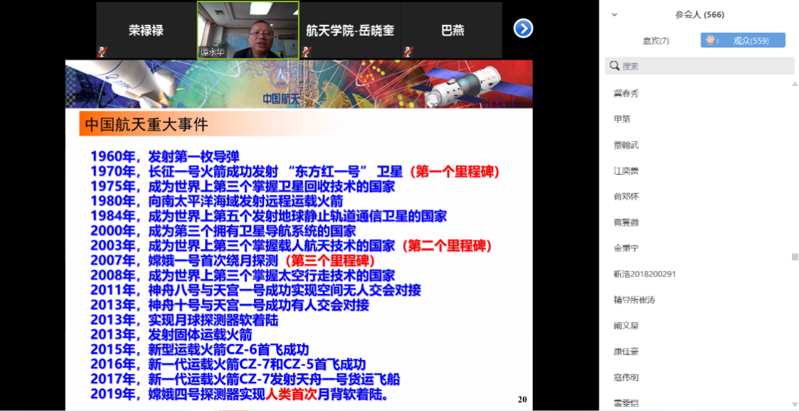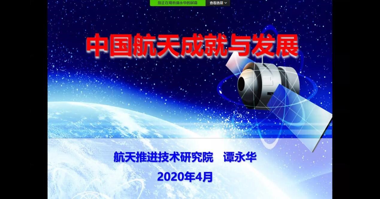 4月22日,在第五个“中国航天日”来临之际,西北工业大学举办翱翔名家讲堂,西北工业大学知名校友、中国航天科技集团第六研究院谭永华研究员作题为《中国航天的成就与发展》,近千名师生齐聚云端聆听了本场报告,报告会由免费直播