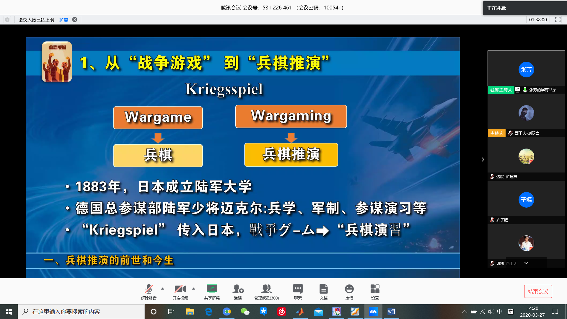 为深入贯彻落实国家国防教育办公室下发的《2020年全民国防教育工作安排》(国动教育﹝2020﹞1号)有关内容和要求,进一步提升陕西省兵棋推演比赛项目的科学化、整体化水平,助力我省国防教育工作广泛、深入、持久地开展,3月27日14:00,我校通过腾讯会议举办了西北工业大学2020年国防教育活动月主题报告会,火箭军工程大学张芳大校受邀作了题为《兵棋推演—让你了解未成形新技术潜力的有效工具》。本次报告吸引了150余名工大学子以及来自西安交通大学、西安理工大学、北京科技大学、北京化工大学、中北大学、边海防陆军学院、航天一院等军地院校共计300名师生齐聚云端。会议由免费直播