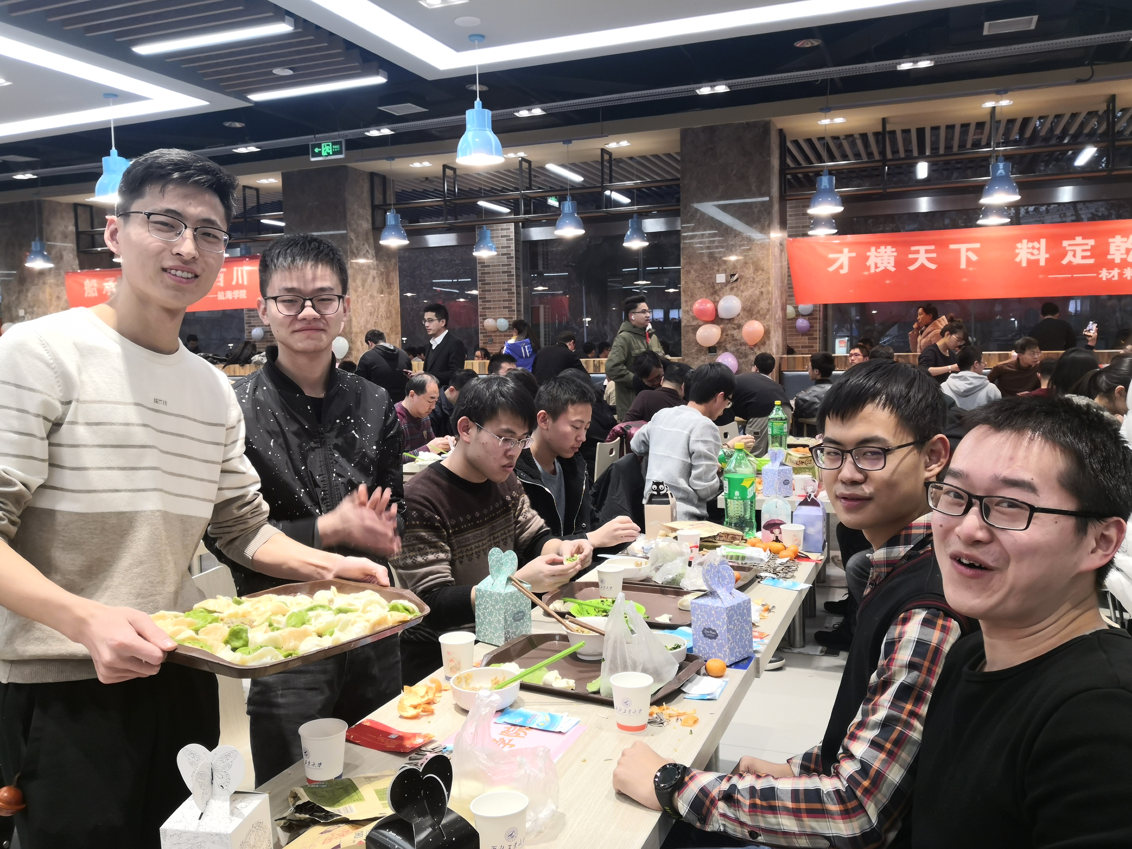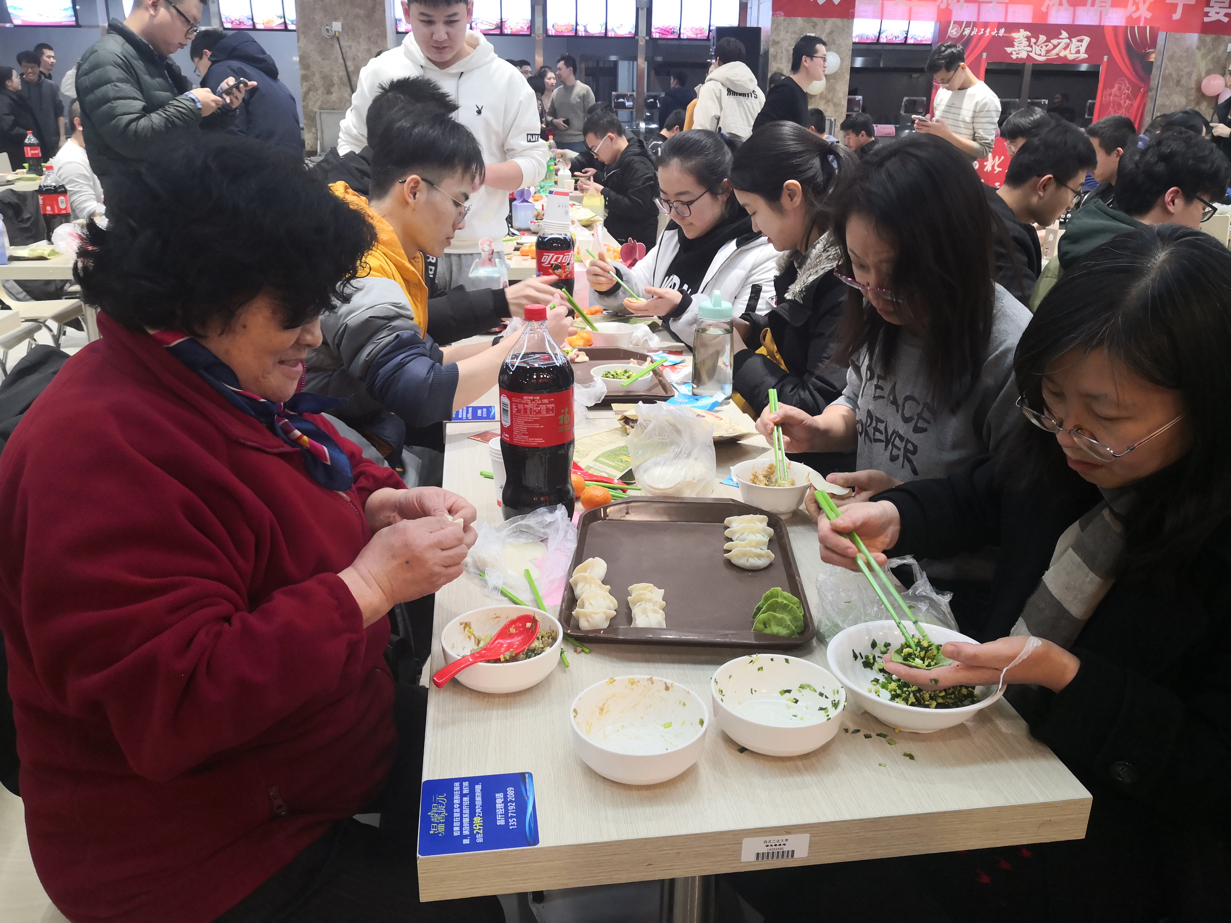 的同学们亲切交谈,表达学校对同学们的关心与爱护,了解学生心中所思所想,并对同学们送上新年祝福。同学们发挥奇思妙想,激情创作,各种形状的饺子诞生。有的饺子中包裹着硬币和花生,吃到的同学收获了大家真诚的祝福。团圆餐其乐融融,节日氛围浓厚。最后,在“包饺子大赛”、“倒念词语比赛”等形式多样的活动中,包饺子活动圆满结束。